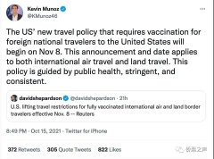 国药、科兴接种者可入境美国!11月8日开始实施新的旅行政策!2021年10月15日,美国白宫新闻秘书长凯文.穆尼奥斯(Kevin Munoz)在推特发布:“拜登政府计划从11月8日开始实施新的旅行政...