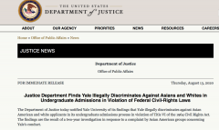 美国司法部裁定耶鲁大学招生时非法歧视亚裔美国人和白人