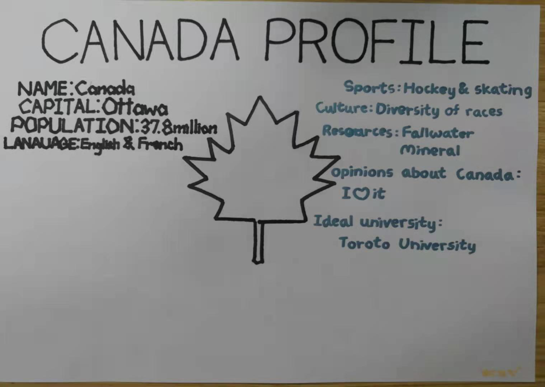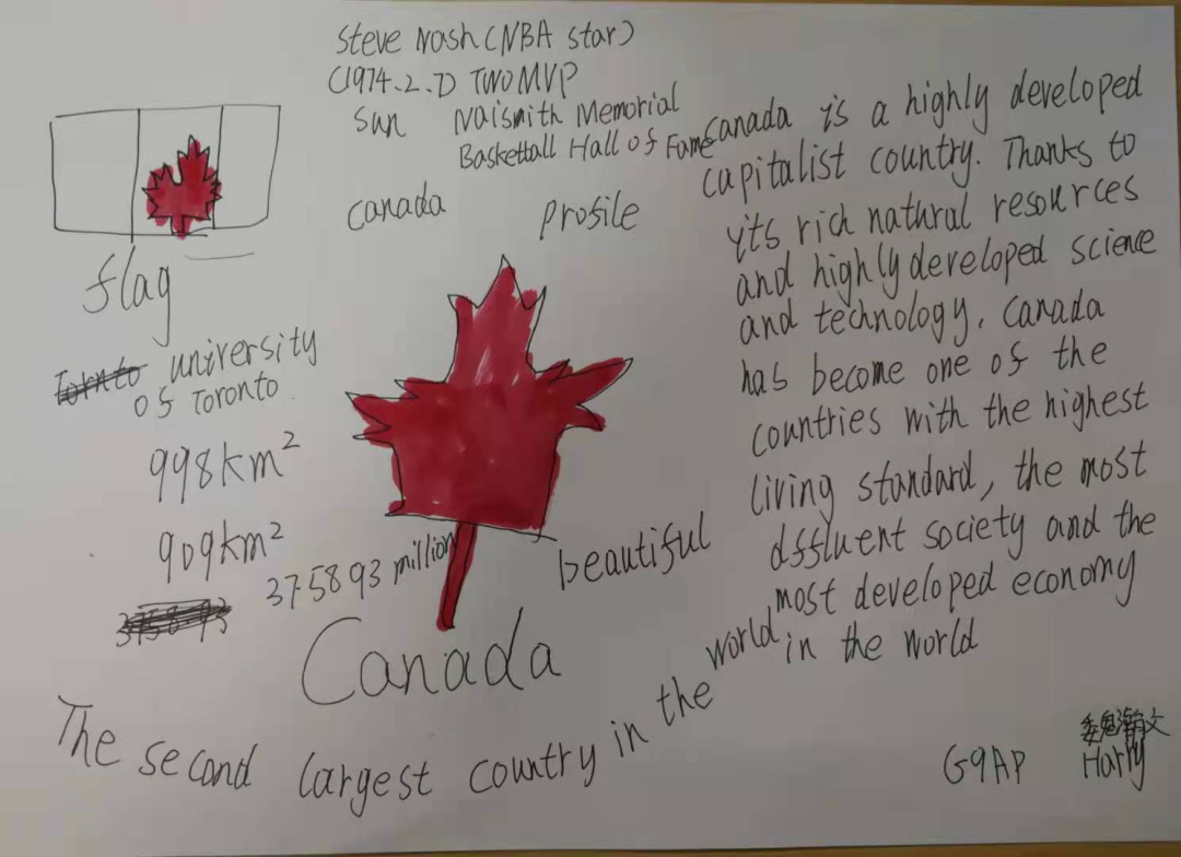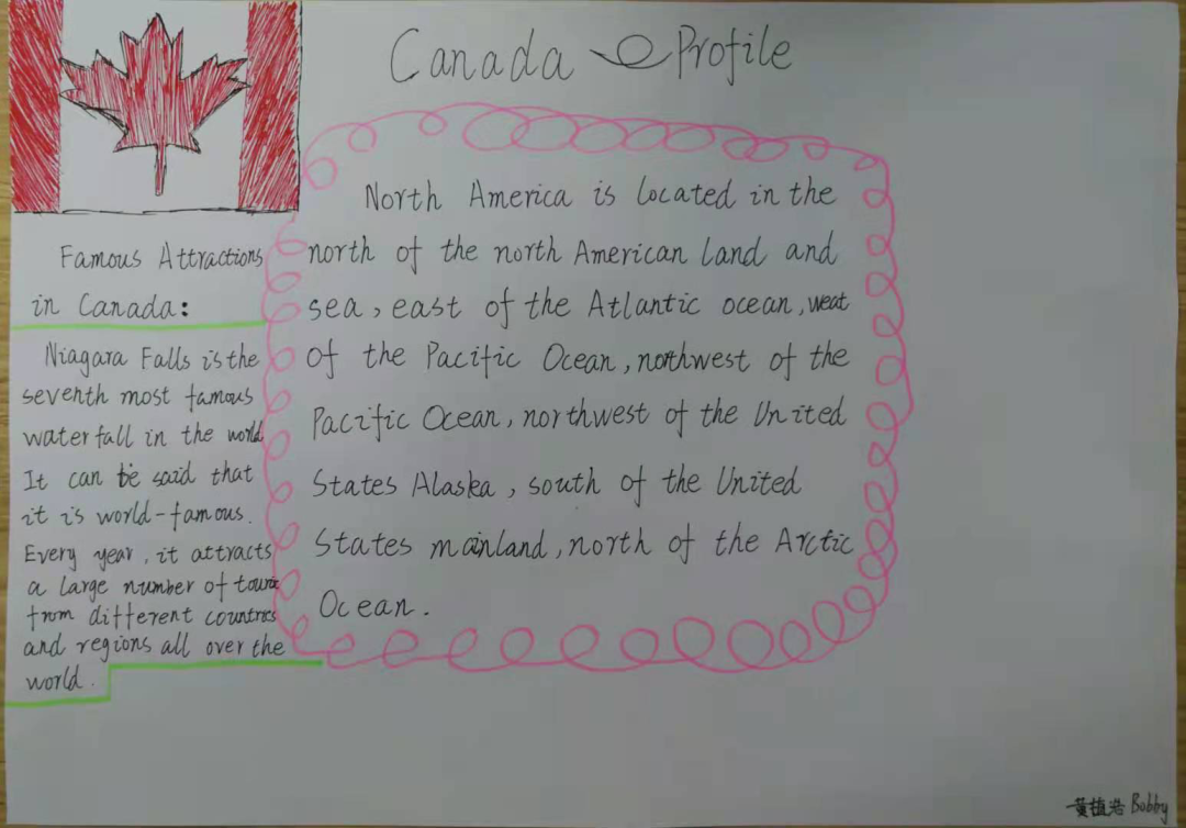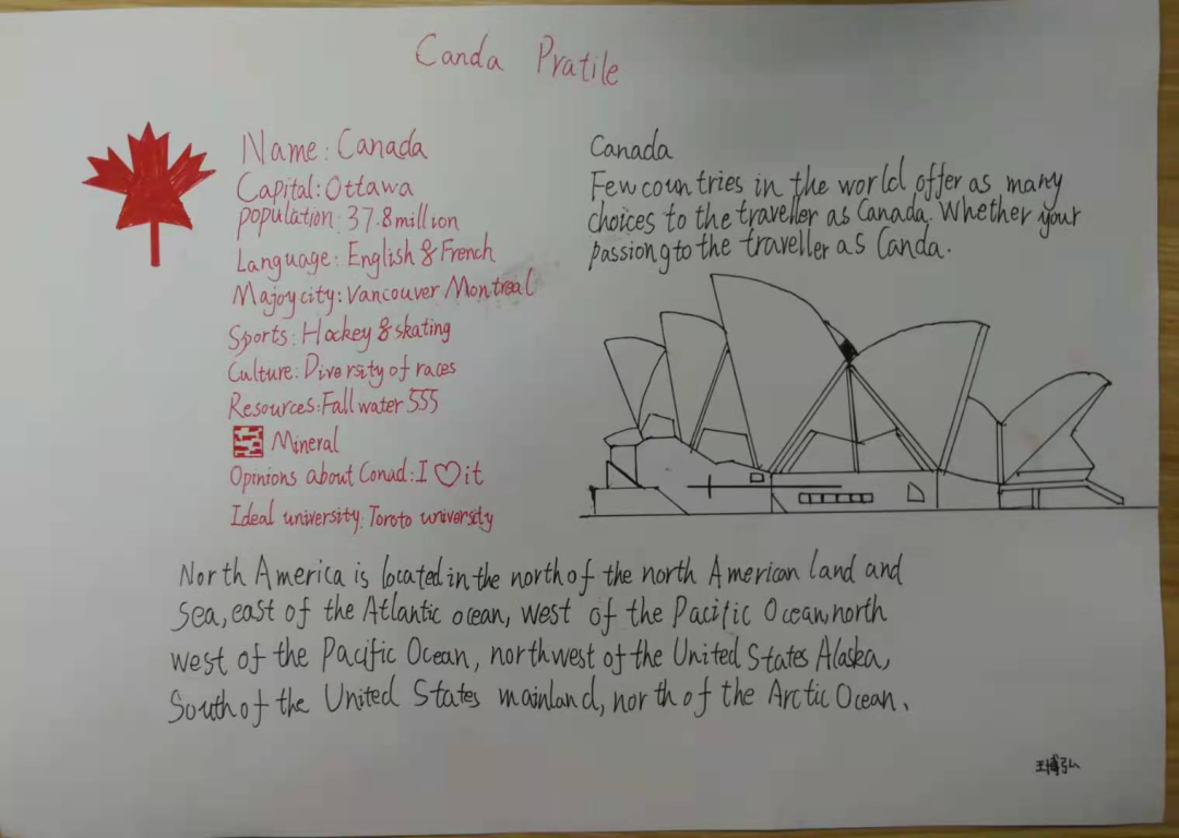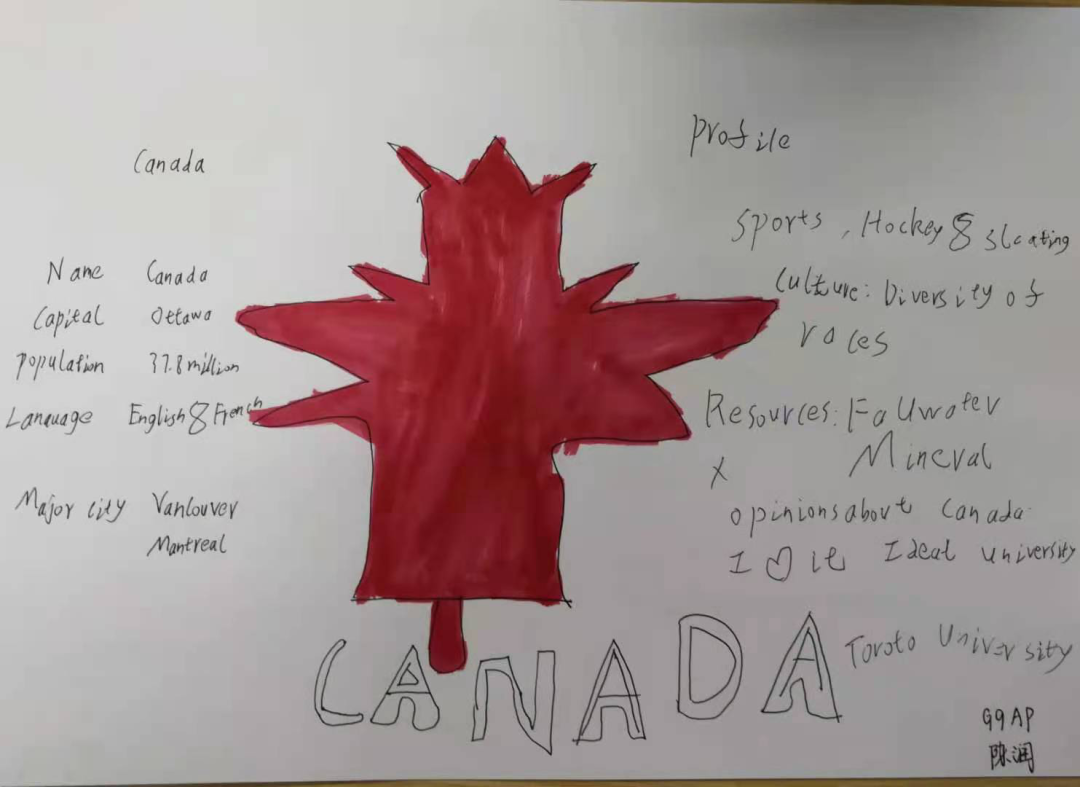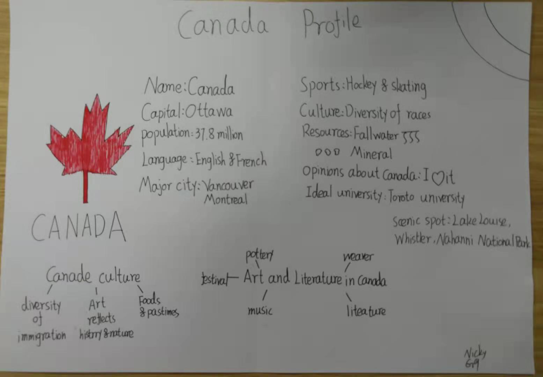 加拿大的自然景观鬼斧神工,加拿大的人文独具风味,我们国际高中九年级美高班学生在人文地理课堂上,其实已经做了一点小功课,我们完成了关于加拿大礼仪、政治、食物、建筑、音乐、著名景点、运动、动物和名人故事的PPT课后作业,并且在课下完成了关于加拿大介绍的手抄报。