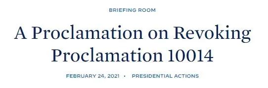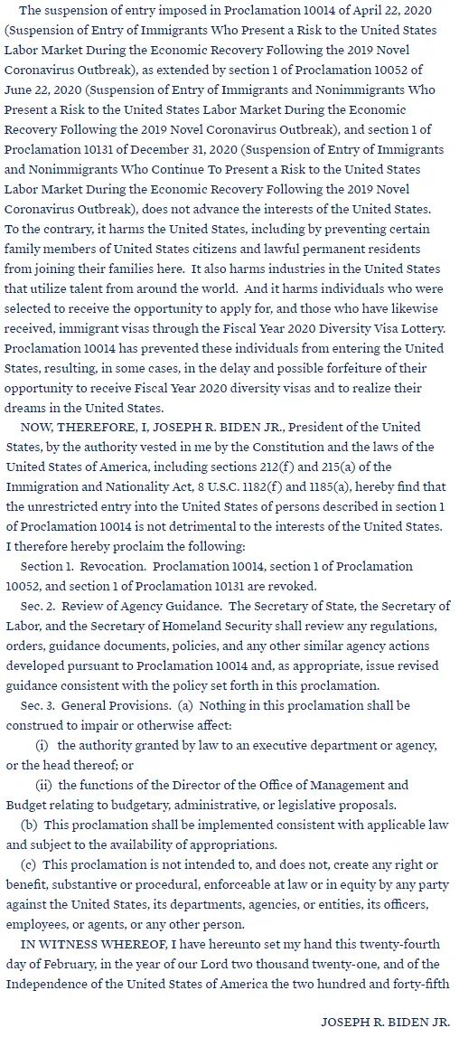 因此根据《美利坚合众国宪法》和法律,包括《移民和国籍法》第 212(f)节和第 215 (a)节、《美国法典》第 8 卷第 1182(f)节和第 1185(a)节赋予我的权力——美国总统约瑟夫R拜登,特此认定第 10014 号公告第 1 节所述内容不会损害美国的利益。