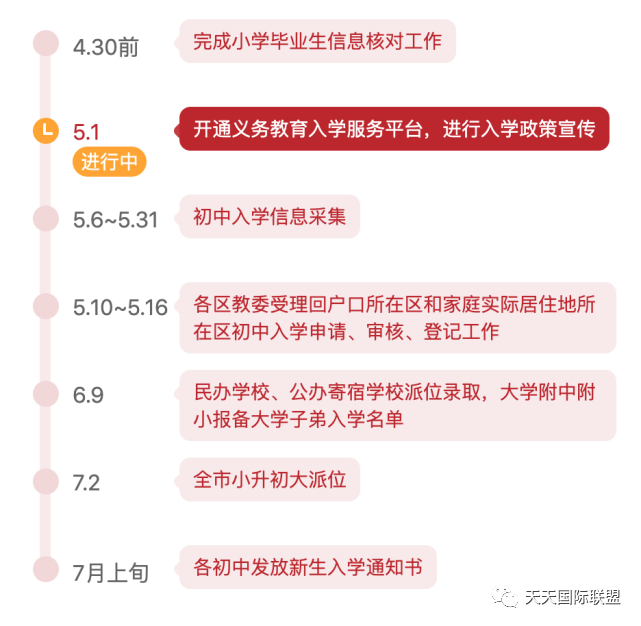 初中入学信息采集时间为5月6日至5月31日。5月10日至5月16日,各区教委受理回户口所在区和到家庭实际居住地所在区初中入学申请、审核、登记工作。7月2日,本市将统一使用市级小升初派位系统进行派位。