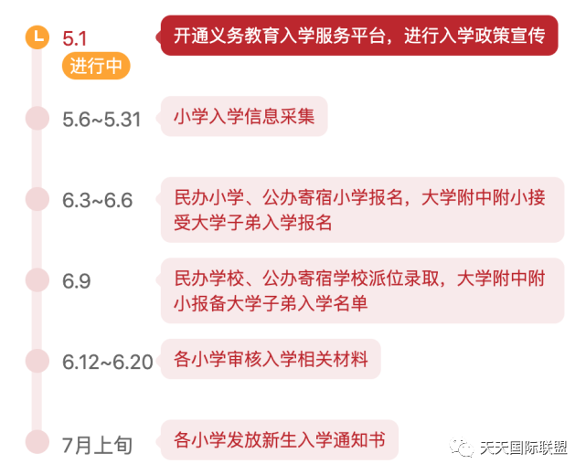 本市民办义务教育学校与公办学校同步报名、同步开展录取、同步注册学籍。6月3日至6月6日,民办小学、公办寄宿小学报名,大学附中附小接受大学子弟入学报名。6月9日,民办学校、公办寄宿学校派位录取,大学附中附小报备大学子弟入学名单。