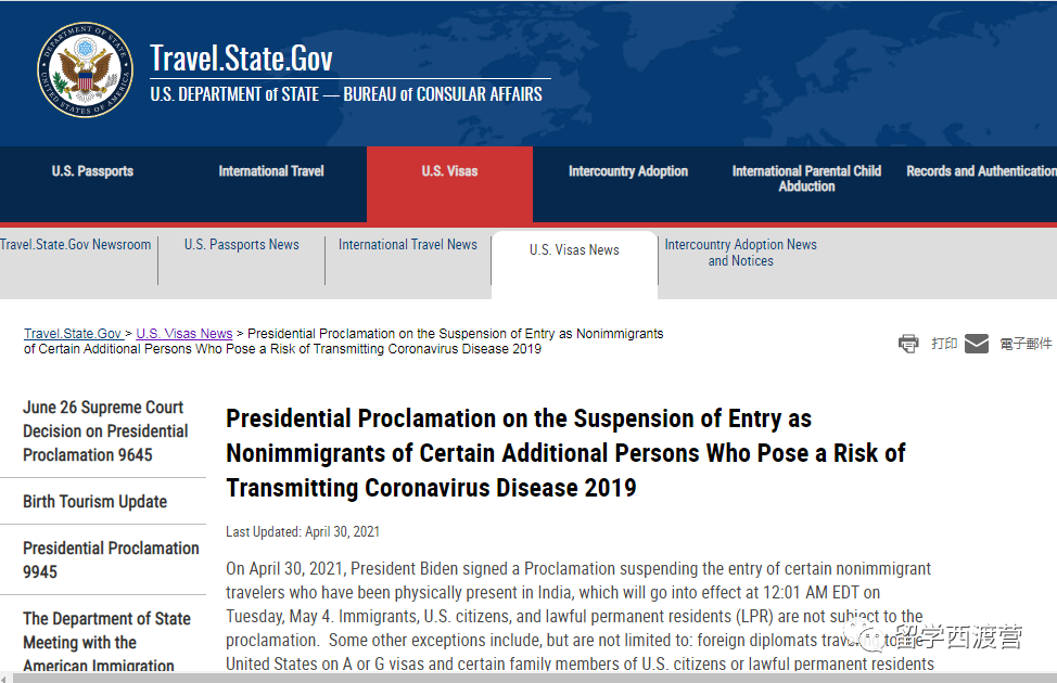 美国国务院领事事务局官网发布的旅行禁令中,