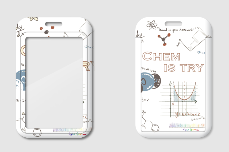 设计说明:将二次函数、化学式、物理公式等元素集合到校卡当中,营造一种浓厚的科技感。“CHEM IS TRY”主题语的应用,激励学生发扬不惧失败、勇于尝试的科创精神。