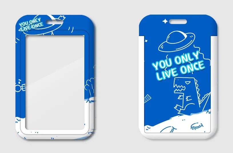 设计说明:鉴于本卡套受众群体是学生,所以我选择夸张又简单的绘画风格,描绘一只生活在外太空愤怒的小恐龙被飞碟带走的场景。颜色选择蓝白搭配,使画面与外太空更加和谐,大胆发挥想象增加趣味性。