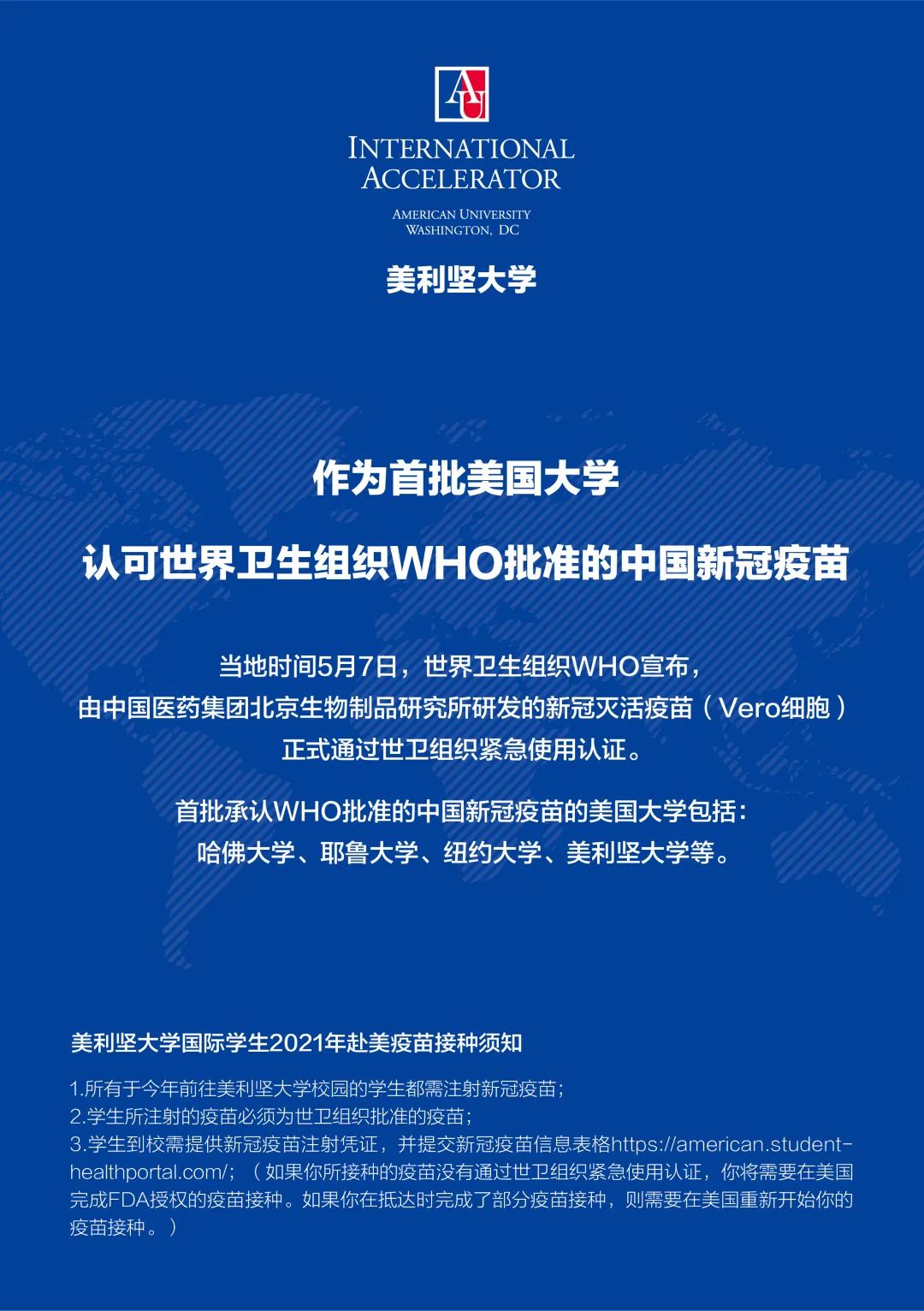 其中,美利坚大学、贡萨加大学、伊利诺伊大学芝加哥分校、麻省大学阿默斯特、麻省大学波士顿分校、太平洋大学都承认世界卫生组织WHO批准的疫苗,这其中包括中国的中国国药 (Sinopharm)和北京科兴 (Sinovac)疫苗。
