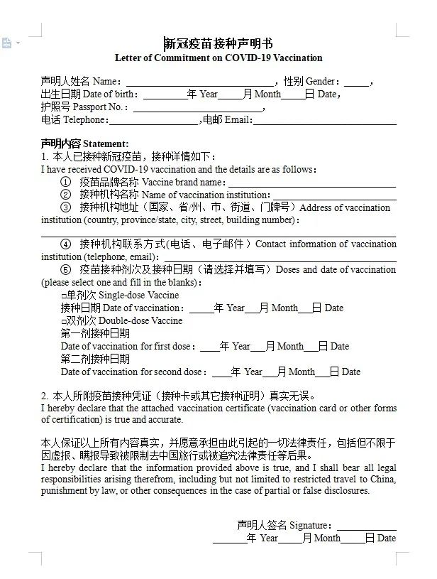 3、完成新冠疫苗接种证明(须含赴华人员姓名、出生日期、接种机构名称、疫苗名称、接种剂次及接种时间等必要信息)。
