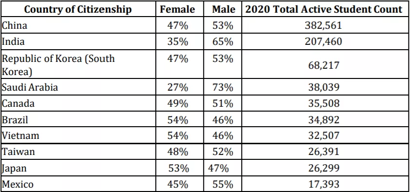 留美学生十大生源国家/地区PS:本报告中的国际学生统计为SEVIS系统Active状态的学生,这意味着2020年入学、目前在美国境外上网课、SEVIS系统未激活的学生并不在统计之内。