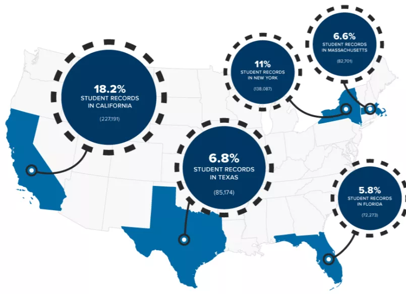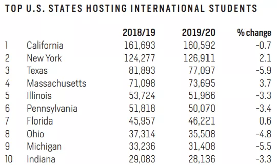 数据还显示了还最受国际生欢迎的留学地区,可以看出,吸引留学生最多的州是加州、纽约州、德克萨斯州。