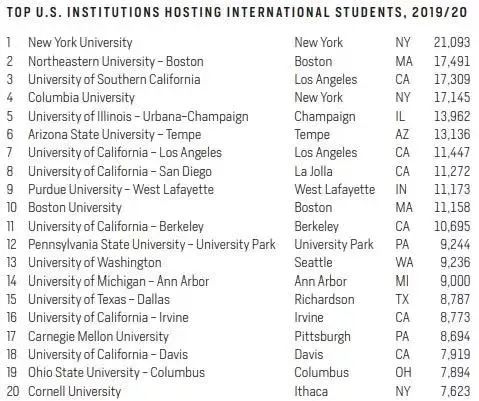 美国最受国际学生欢迎的地区在国际生人数方面,纽约大学连续七年国际学生人数排名第一,东北大学仍然紧随其后,是国际生第二喜欢的高校。