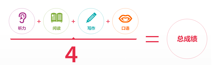 总分=(听力分数+阅读分数+写作分数+口语分数)/4。