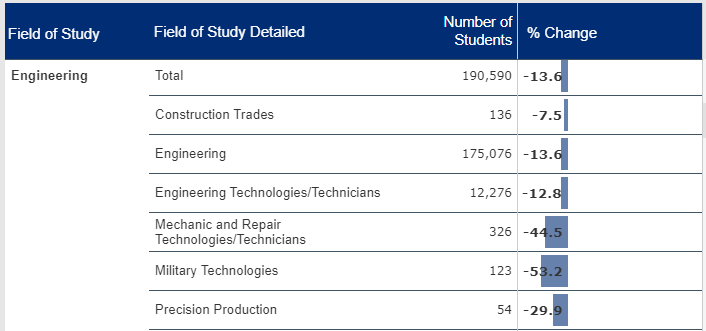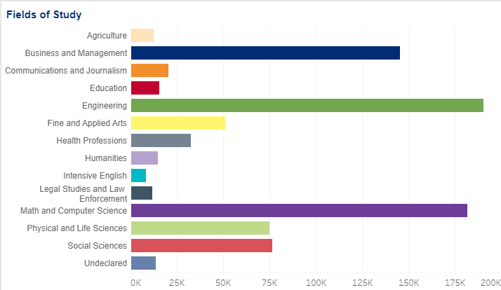 STEM依然是热门专业,工程专业依旧第一,但就读人数较去年再次减少,此次下降13.6%,为190,590人。虽然选择工程专业的学生人数有所下降,但是依旧占到总人数的20.9%。