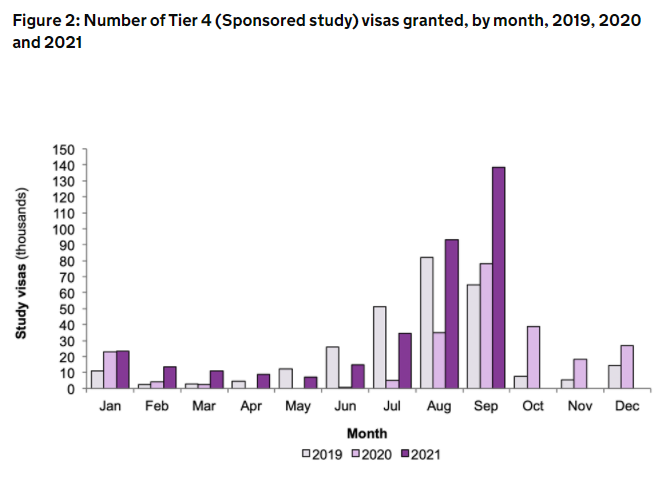 从过去3年英国学生签证发放数量的按月柱状图,可以看出,2020年受到疫情影响最大,很多留学生的入学时间延迟了数月甚至半年,导致“下签”高峰从传统的7月8月9月,延迟到10月-12月。而2021年9月的下签数量已经远远超过疫情前。