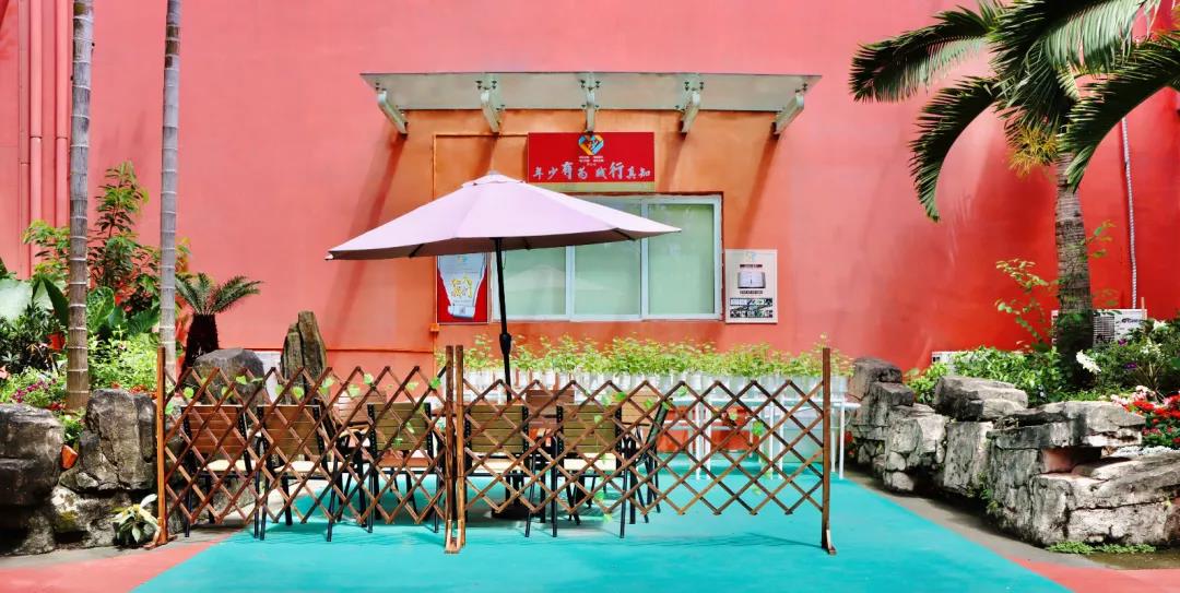 鲜艳耀眼的红色墙体,掩映在繁盛的树木之间,有一种和谐的宁静之美。
