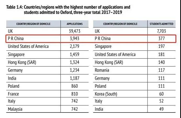 根据牛津大学官网发布的数据,2017-2019年牛津大学的中国学生申请人数共3943人,其中377人拿到offer;
