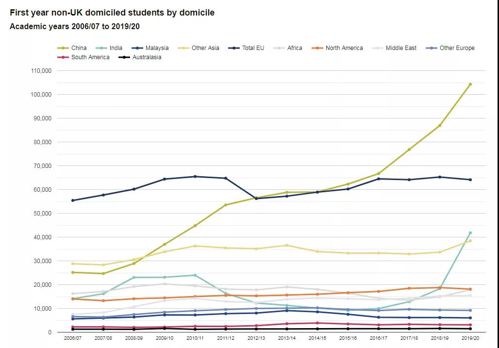 英国留学生总数超过55万,其中14.2万来自中国大陆地区,占非欧盟留学生的35%。