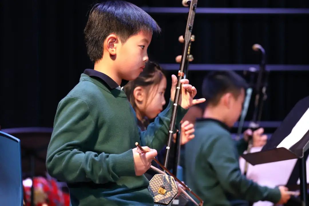 四年级的Michael是小学部二胡首席,中美混血的他因为偶然被路边的二胡声音吸引,便在父母的支持下在校内学习二胡,他分享道:彩排时候出错了,但是正式演出时一个人都没有出错,这是我最开心的事。