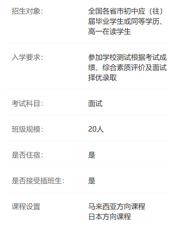 经历国内三年针对性的学习,通过相关培训可以获得国际认可的国内高中文凭,并根据雅思考试或者日本大学考试及国内学术课程、素质课程等成绩申请马来西亚或日本院校,帮助学生顺利进入马来西亚院校、日本或英联邦制国家的大学进行深造学习,从而取得国际及国内认可的学历学位。