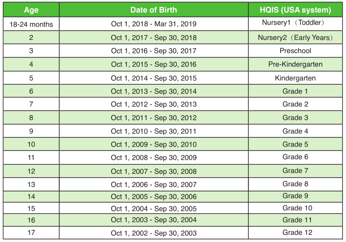 Students are admitted and placed in a grade level after considering their age, achievement level, grade level at their previous school, and emotional and physical maturity. In addition, HQIS will always take into account the student's country of origin, the educational system from which the student comes, as well as the student's past performance in that system. The age placement cut off date is September 30.