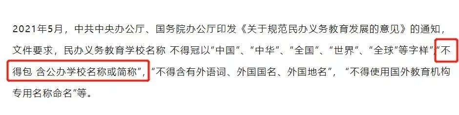 2021年5月,中共中央办公厅、国务院办公厅印发《关于规范民办义务教育发展的意见》的通知:民办义务教育学校名称不得包含公办学校名称或简称。