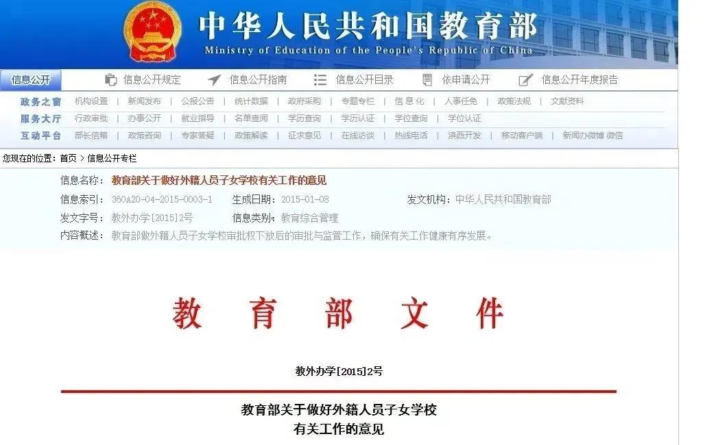 早在2015年,教育部发布了《教育部关于做好外籍人员子女学校有关工作的意见》,其中对招收外籍学生的学校命名等方面进行了规范: