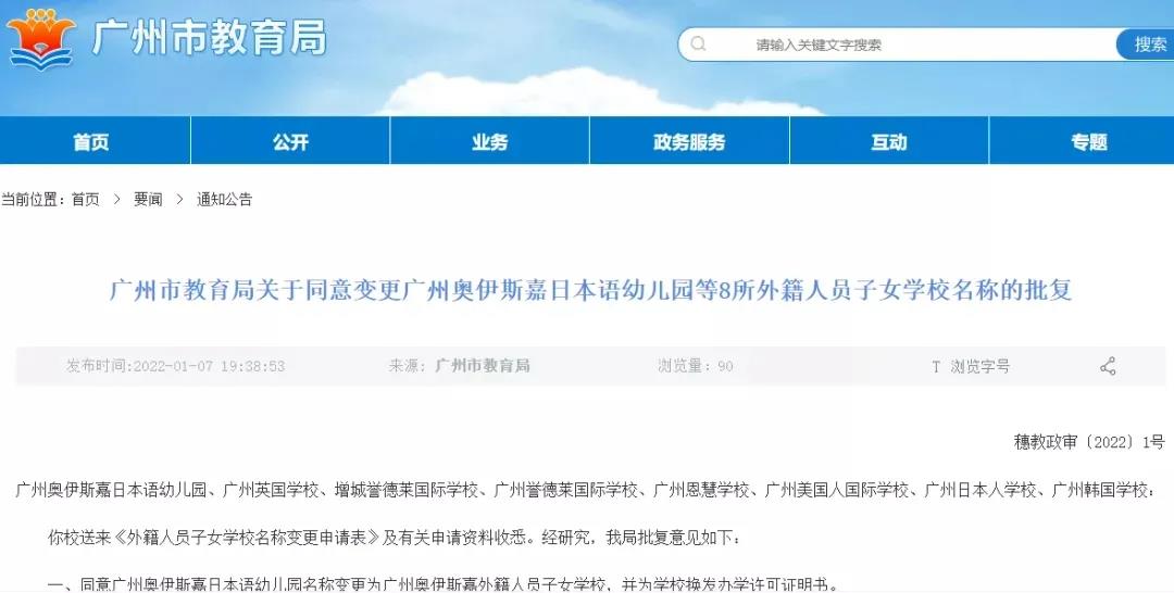 1月7日,广州市教育局网站发布了《关于同意变更广州奥伊斯嘉日本语幼儿园等8所外籍人员子女学校名称的批复》