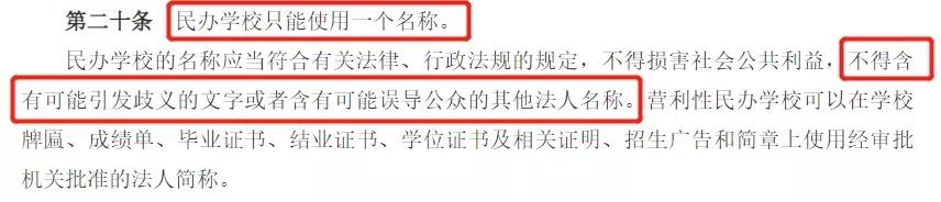 加上近日发布的《中华人民共和国民办教育促进法实施条例》,更是对民办学校的名称做出了严格要求:民办学校只能使用一个名称,且应当符合有关法律、行政法规的规定,不得损害社会公共利益,不得含有可能引发歧义的文字或者含有可能误导公众的其他法人名称。