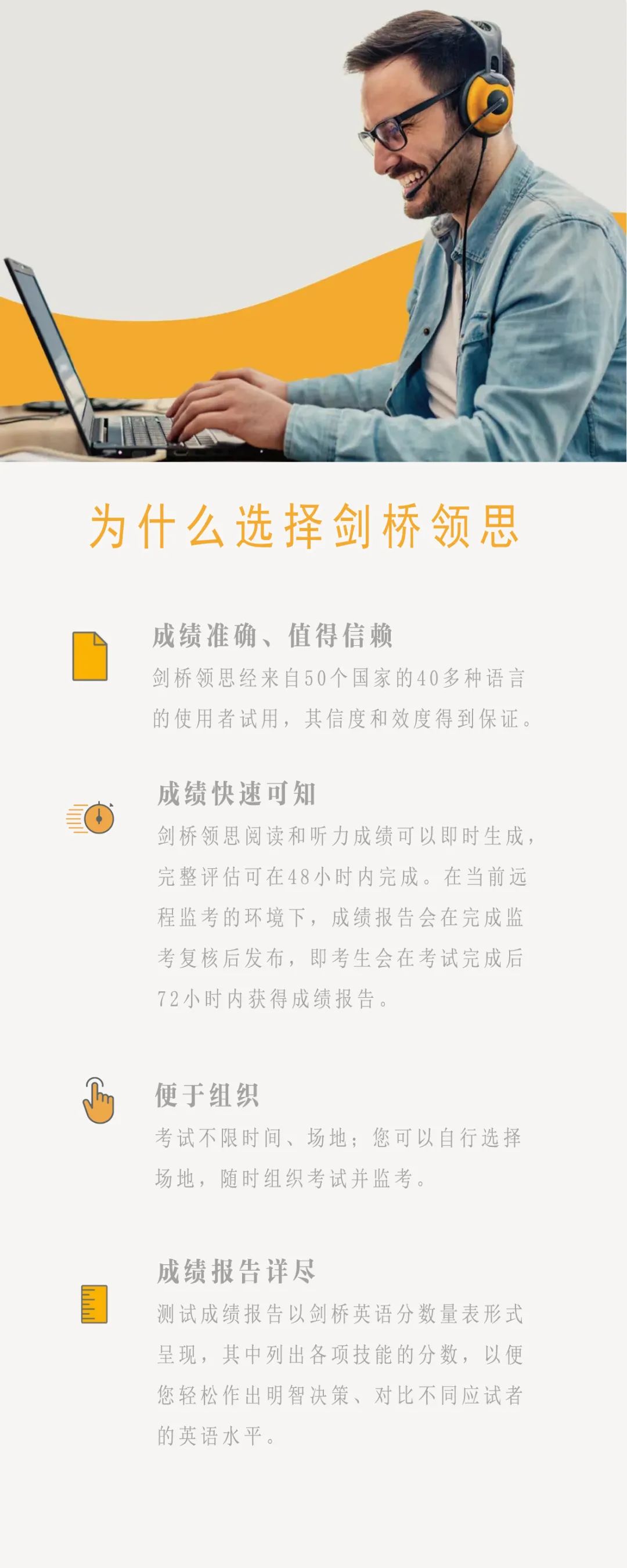 剑桥领思(Linguaskill)是由剑桥大学英语考评部研发的一项引领时代的人工智能(AI)测评产品。它可以准确、快速、便捷地测试应试者的英语听、说、读、写水平,帮助组织机构和考生足不出户完成测试。剑桥领思阅读和听力成绩即时生成,完整评估在48小时内完成。在远程监考的环境下,成绩报告会在完成监考复核后发布,即考生会在测试完成后72小时内获得成绩报告。剑桥领思自推出以来就备受推崇,已获得数千家国际组织机构的认可。