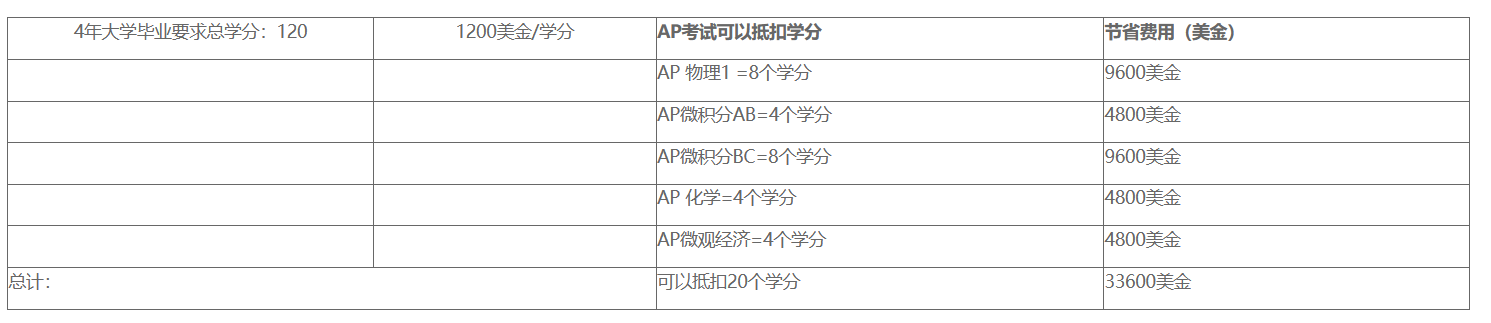 折抵大学学分,省时又省钱美国大学采用的是学分制。AP课程的成绩采取5分制,3分以上的成绩为绝大多数美国大学接受。考试通过的AP课程可以折抵大学学分,减免大学课程,缩短大学学时,更可以节省高昂的大学学费。另外,AP考试在全球80个国家举行,英国、加拿大、澳大利亚等国也将此作为发放奖学金的主要条件之一。