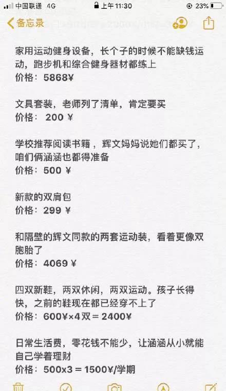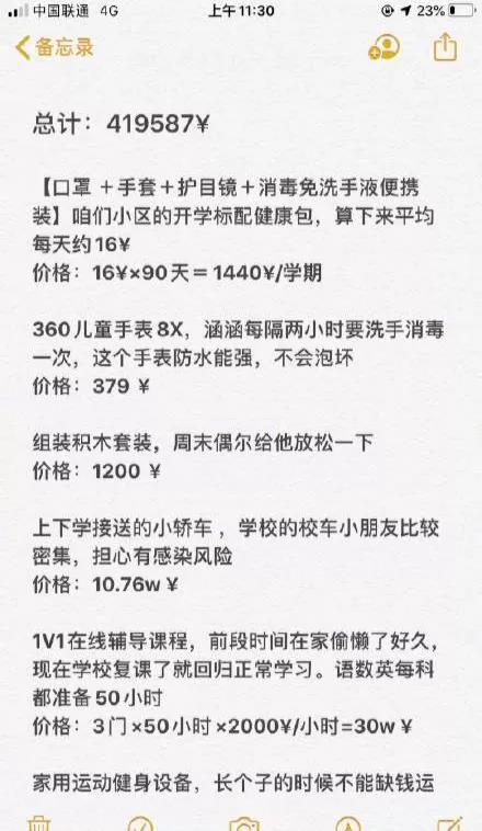 除了阿姨的工资,如果有送娃上下学的家庭司机,又是一笔开销。在生活上还有衣食住行等费用,每个家庭都不同,比如下面这位妈妈。