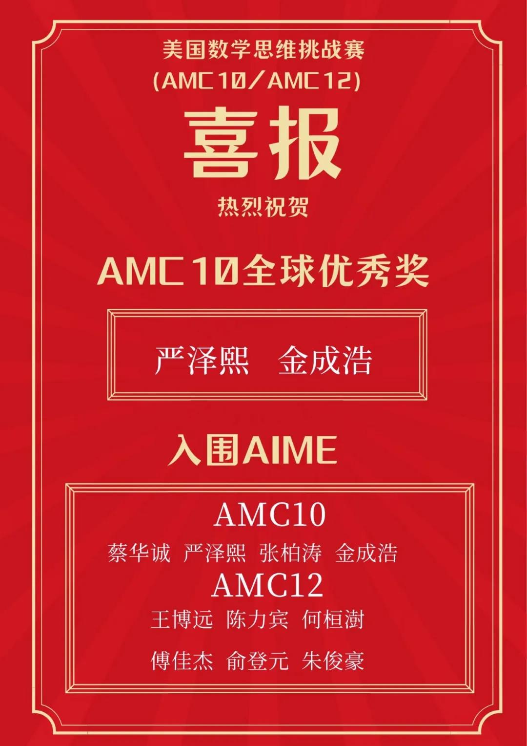 高一年级严泽熙和金成浩同学更以出众的成绩获得了全球优秀奖(Honor Roll)。恭喜入围同学,预祝他们在AIME数学邀请赛中获得更加优异的成绩!
