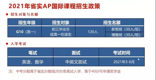 2021年省实AP招生政策中,应届生中考分数高于省实分数线40分可申请奖学金。