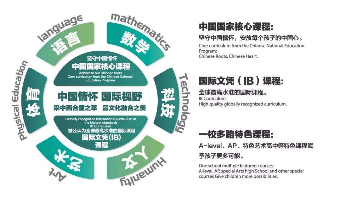 这三大板块分别为:中国国家大纲核心课程、国际文凭(IB)教育理念与一校多路特色课程。