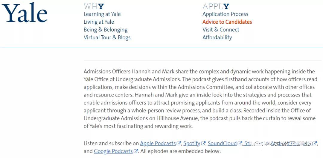 耶鲁大学招生办陆续录制了共22集的系列谈话节目《走进耶鲁招生办》,涉及阅读申请材料、招生委员会内部流程、疫情影响、申请主文书、补充文书、面试、推荐信、12个申请谎言等各个方面。