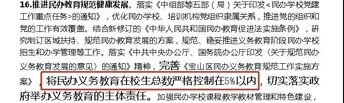 根据2月11日上海市宝山区教育局印发的《上海市宝山区教育局2022年工作意见》,该意见上面明确强调了将民办义务教育在校生总数严格控制在5%以内,切实落实政府举办义务教育的主体责任。