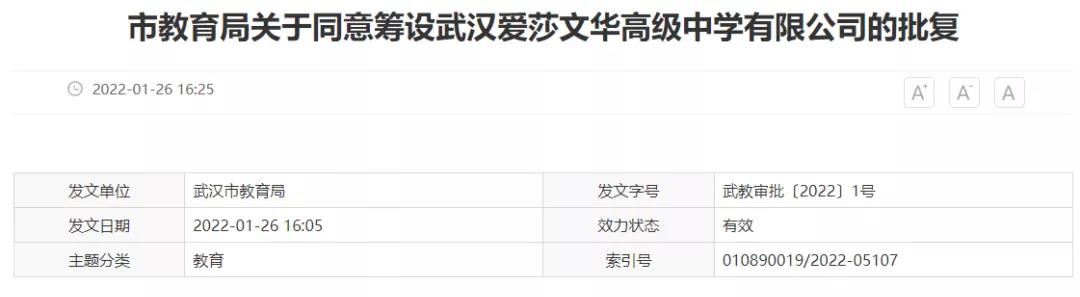 需要注意的是,开设K12学段的武汉爱莎国际学校分为一所外籍人员子女学校和一所民办外国语学校,其中的民办学校“武汉爱莎文华高级中学”已在2022年1月26日被武汉市教育局同意筹设为普通高中。