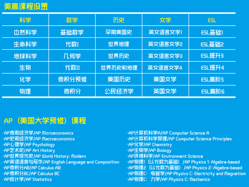 此外在美国高中,作为美国大学入学考试的SAT、ACT考试培训,以及AP课程往往都是选修课程,田家炳国际的课程设置中不仅囊括了美国高考培训,还包含了托福等语言类考试培训、大学申请培训、面试技巧培训、时间管理培训等等。