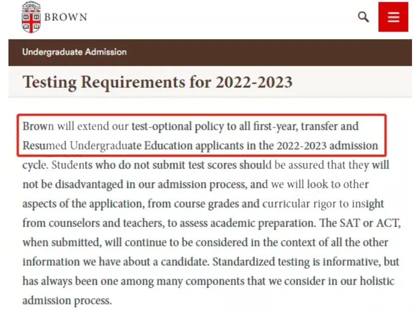 布朗大学2022-2023申请季延续标化成绩可选政策。