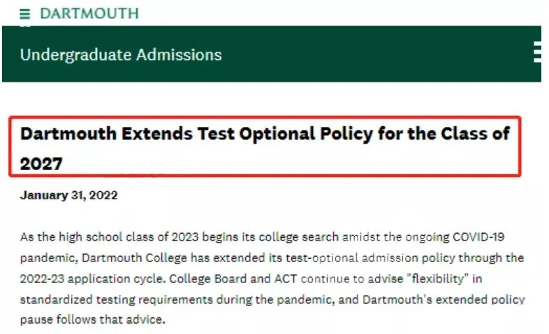 达特茅斯学院2023申请季延续标化成绩可选政策。