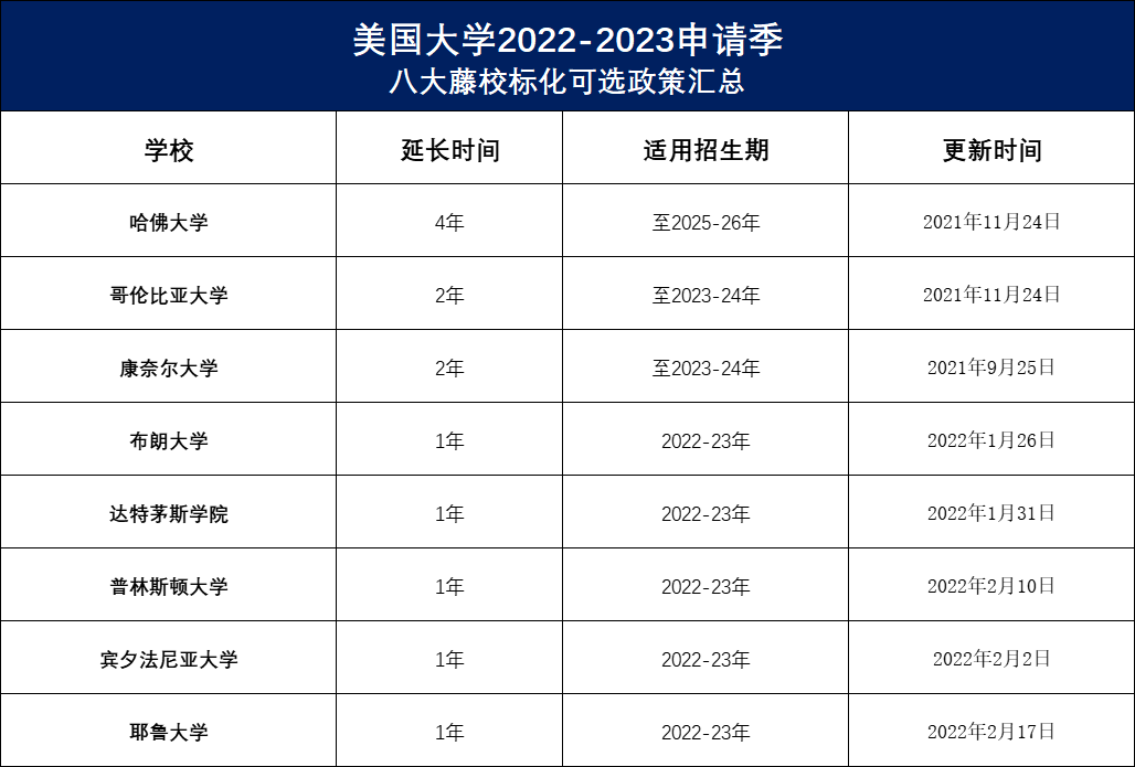 截至目前,8大藤校新申请季对标化的要求全部出台,今天就一起来看看美国八大藤校2022-2023申请季标化成绩要求!