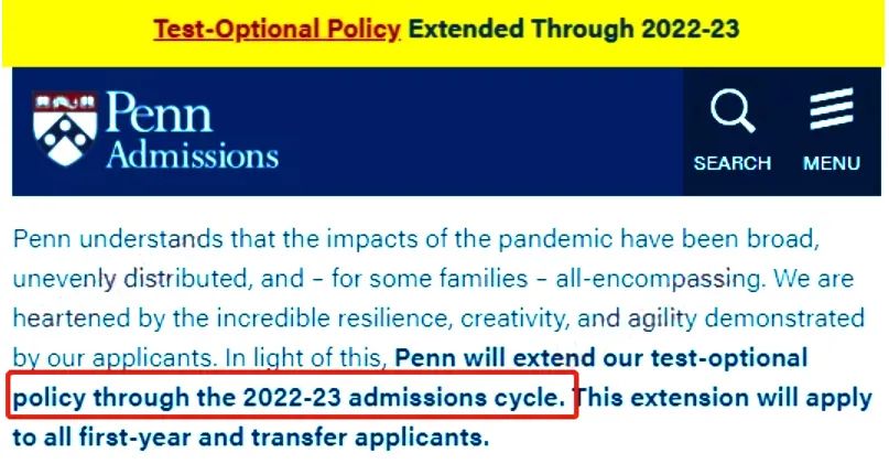 宾夕法尼亚大学在2022-2023年的招生周期中将标化考试作为可选项,此延长将适用于所有本科新生和本科转学的申请人。