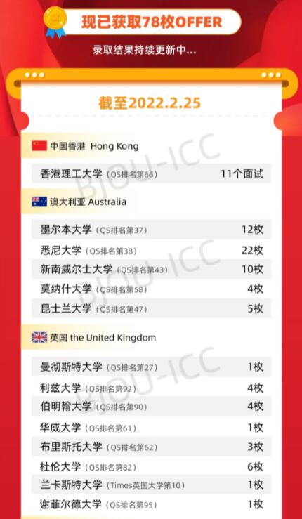 新学期offer雨,迎来新学期开门红!截至2022年2月25日,2022届北京开放大学国际课程中心毕业生100%收获了来自世界大学前50的offer!其中,英国21枚,澳洲53枚,加拿大4枚,共78枚!恭喜孩子们!