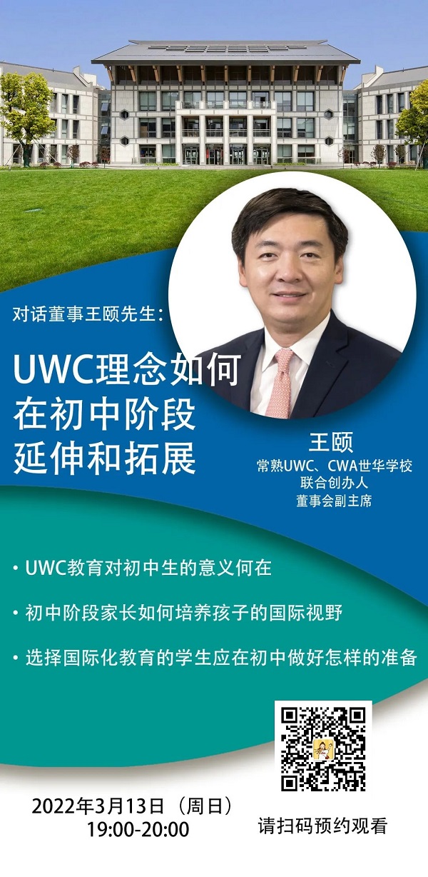 王颐先生周日(3月13日)为大家分享主题为“UWC理念如何在初中阶段延伸和拓展”的线上讲座,帮助更多的孩子在初中甚至更早的阶段就能开启这种国际化教育理念的浸染。