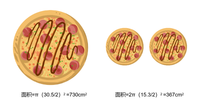 6寸的披萨直径约为15.3,而12寸的披萨直径约为30.5。画出一个直径为30.5的圆形,再将两个直径为15.3的圆放入其中,可以很明显的发现:两者的面积并不对等。其实,只要经过简单的计算即可发现:1个12寸的披萨约等于4个6寸的披萨。