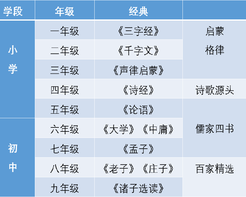 以朗朗上口易读易背的启蒙教材为主,如《三字经》、《千字文》,通过全书精读,让学生对于内容全面理解;