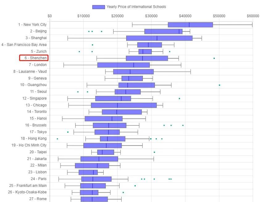 尤其北京和上海的国际化学费都高于深圳,从图中我们也可以看到上海最贵的国际化学校学费要达4万多美元,几乎是深圳最便宜学校学费的两倍。