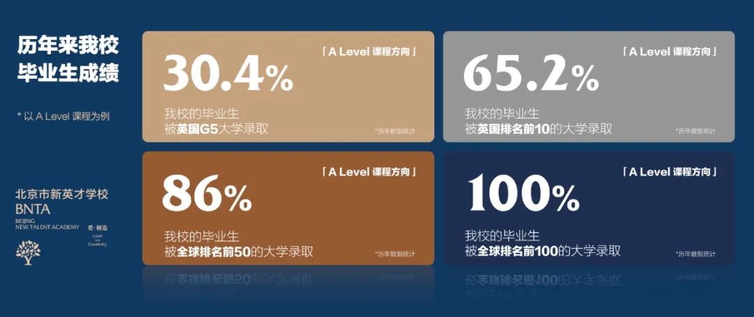 用A Level成绩申请大学的毕业生中,84.3%获得世界前50大学录取或预录取通知;72.5%获得世界前30大学录取或预录取通知;45.1%获得世界前20大学录取或预录取通知;30%获得世界前10大学录取或预录取通知;30%获得英国G5大学预录取。申请加拿大和澳大利亚的毕业生中100%获得世界前50大学预录取。申请美国的毕业生100%获得无条件录取,并获得16万4千美元奖学金。