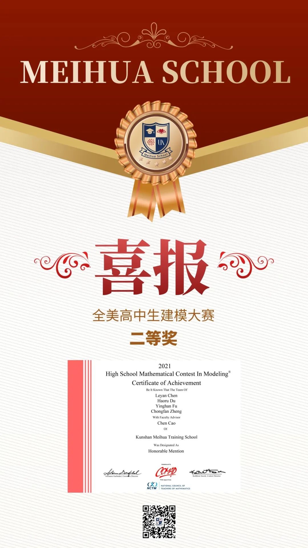 在2021年11月底结束的全美高中生数学建模大赛(High School Mathematical Contest In Modeling)中,美华学校竞赛小组获得全球二等奖(Honorable Mentioned)。
