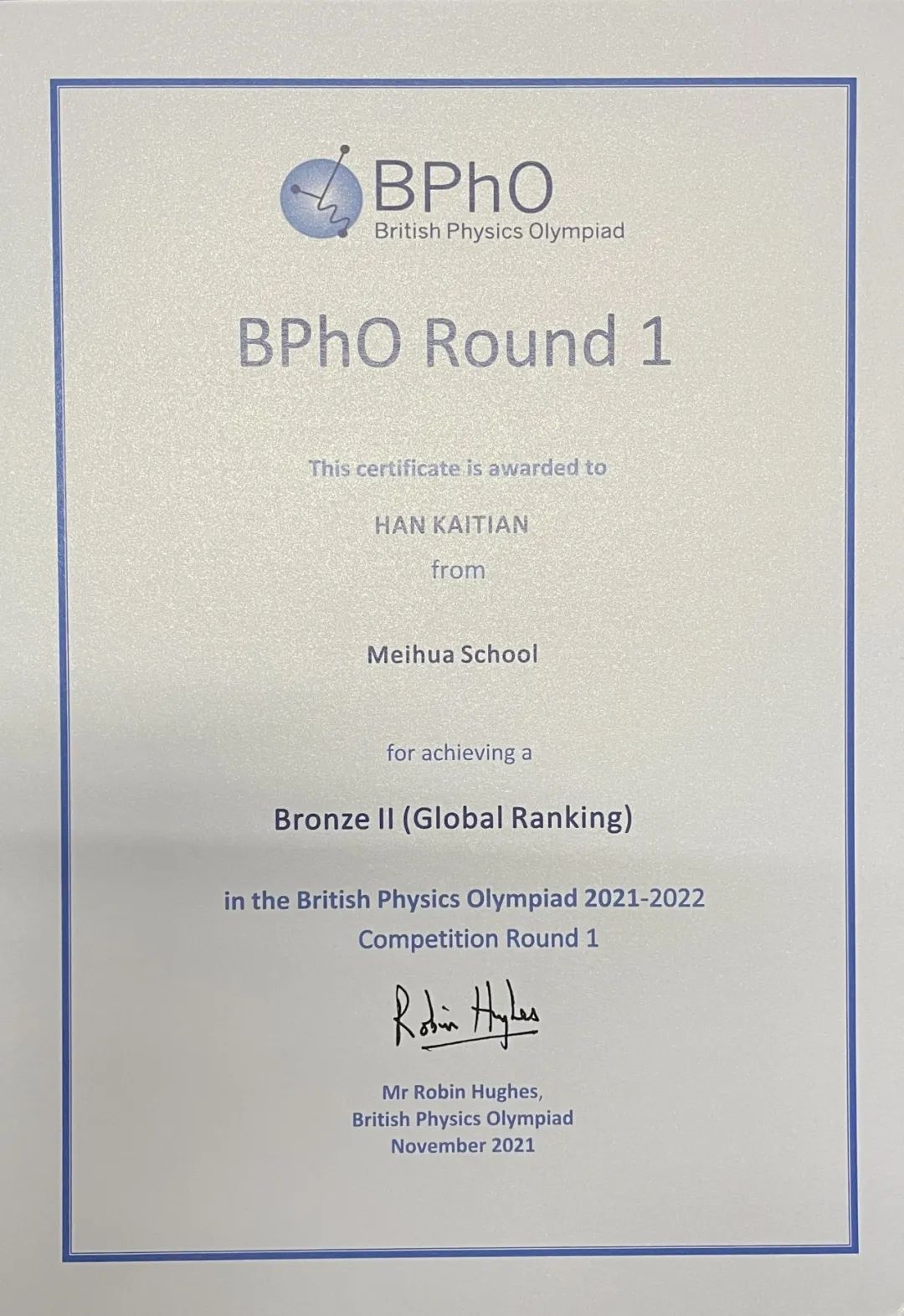 在“爱与陪伴”的成长教育的滋养下,同样是2021年11月份,英国物理奥林匹克挑战赛(BPhO)如期而至,美华学校韩凯天同学凭借其优异成绩斩获全球铜奖(Bronze ll)!