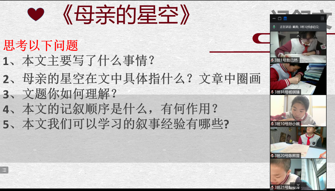 学校线上授课采用腾讯会议形式,运用晓黑板批改作业。尽管是居家线上学习,同学们丝毫不放松,认真听讲,做好课间操和眼保健操,保证运动量,每天午会时间,班主任们组织学生唱励志歌曲,愉悦身心。